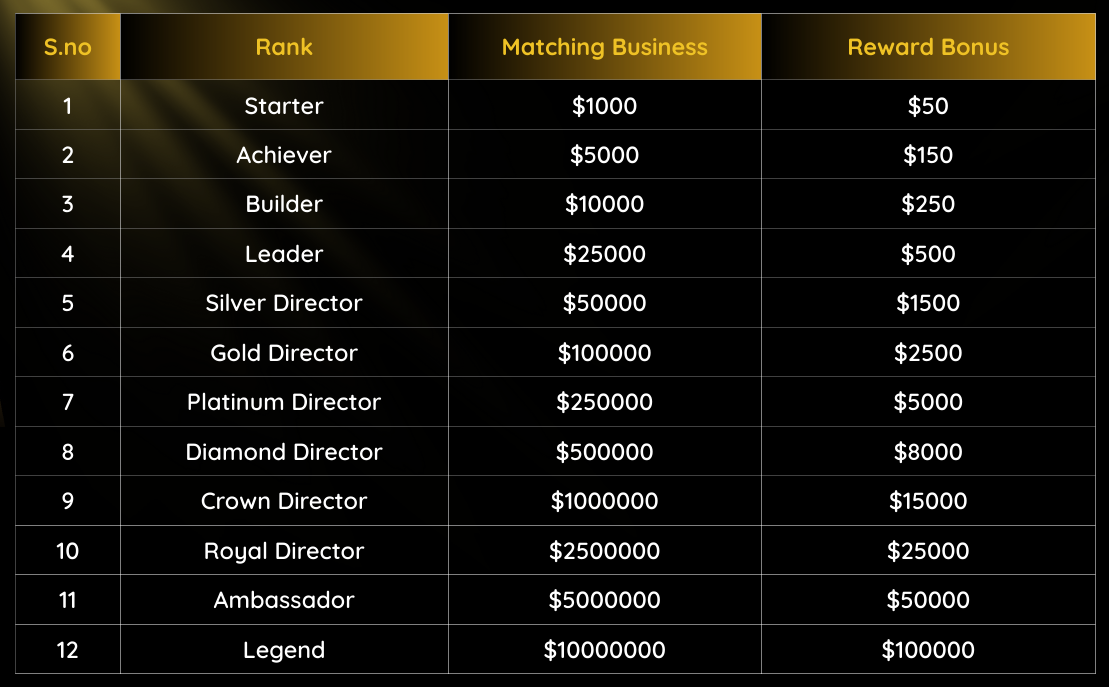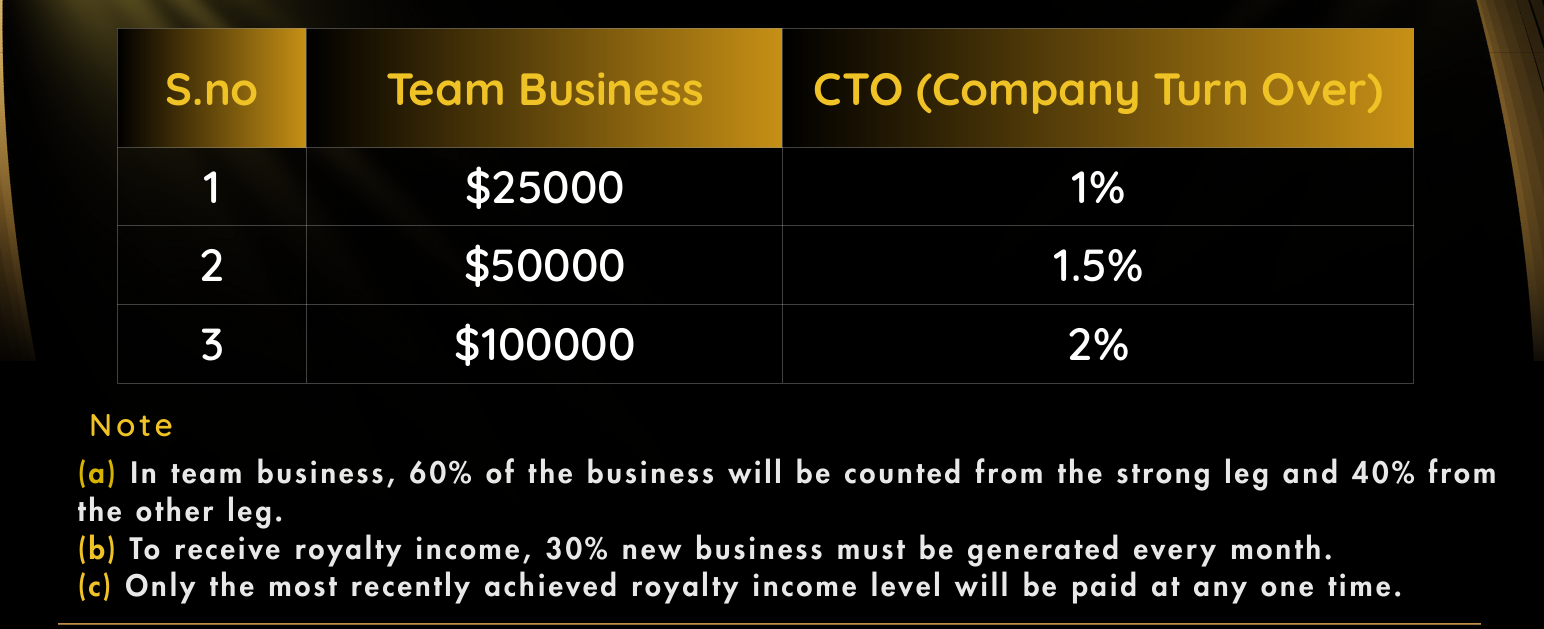 Note:- For rank and reward eligibility, 60% of the total team business must come from the strong leg, and 40% from the other leg